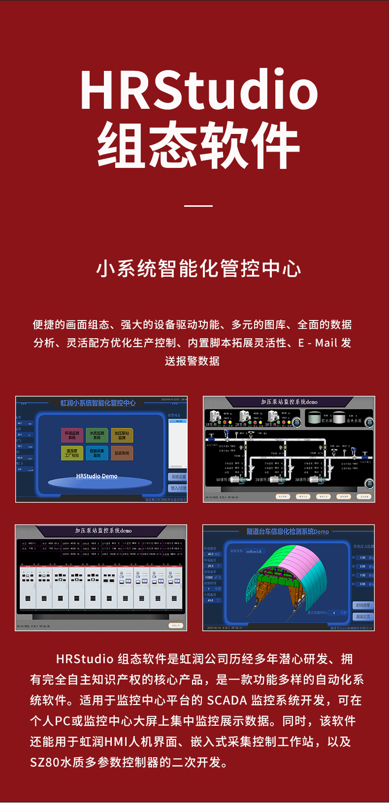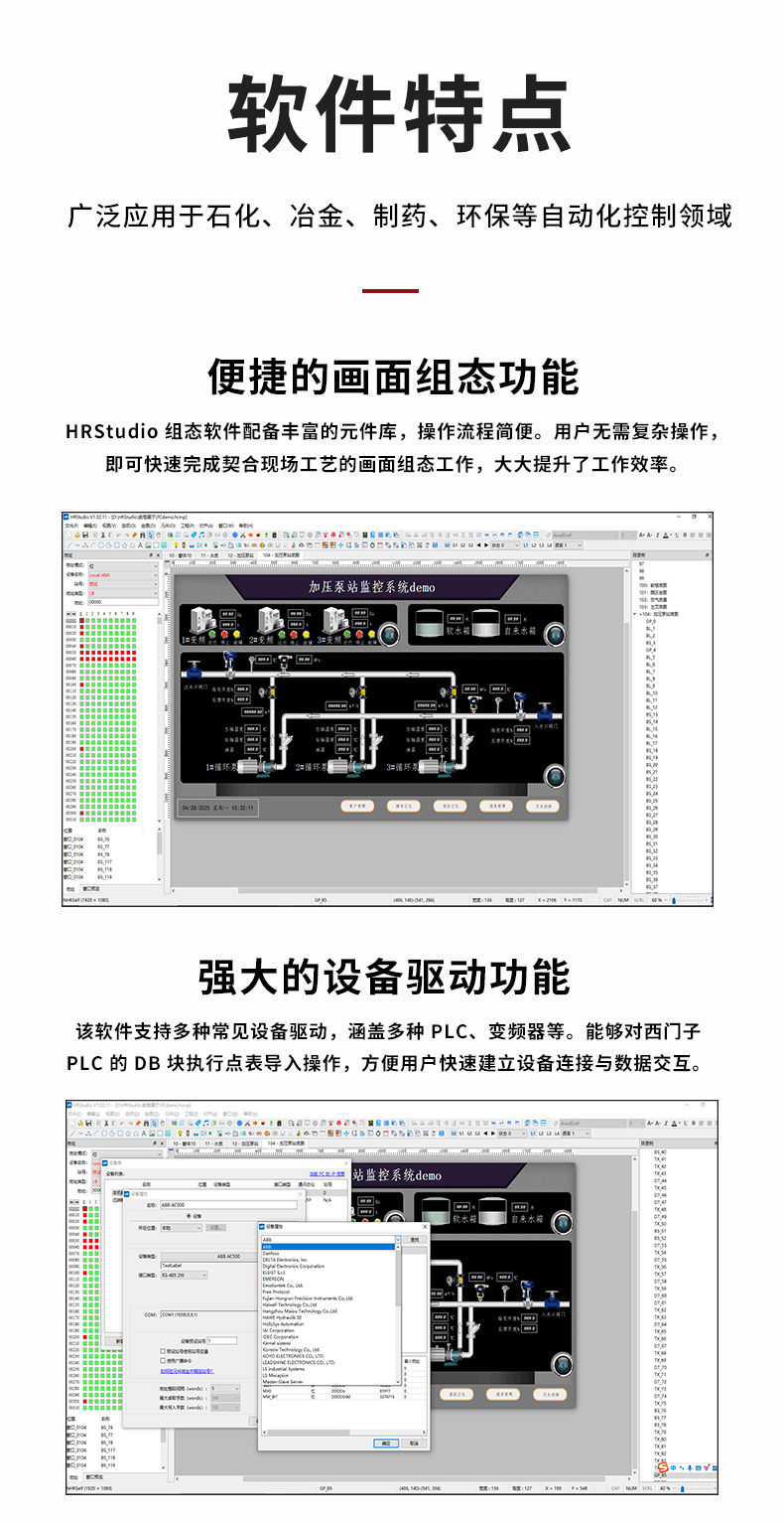 虹潤(rùn)公司是專業(yè)研發(fā)組態(tài)軟件的國(guó)家專精特新“小巨人”企業(yè)。開(kāi)發(fā)的HRStudio組態(tài)軟件,具有便捷組態(tài)畫(huà)面,強(qiáng)大設(shè)備驅(qū)動(dòng),多元化的圖庫(kù),數(shù)據(jù)庫(kù)操作,內(nèi)置腳本拓展,權(quán)限管理數(shù)據(jù)備份等特點(diǎn)。產(chǎn)品獲得嵌入式數(shù)據(jù)采集工作站組網(wǎng)系統(tǒng)等1項(xiàng)國(guó)家發(fā)明專利,主持起草通信系統(tǒng)多通道數(shù)據(jù)采集控制終端規(guī)范軍用標(biāo)準(zhǔn),空間數(shù)據(jù)與信息數(shù)據(jù)傳輸系統(tǒng)等2項(xiàng)航天標(biāo)準(zhǔn),以及現(xiàn)場(chǎng)設(shè)備集成等5項(xiàng)智能制造國(guó)家標(biāo)準(zhǔn)。參與國(guó)際5G標(biāo)準(zhǔn)制定,取得HRStudio 畫(huà)面組態(tài) 等1項(xiàng)相關(guān)軟件著作權(quán)。產(chǎn)品廣泛應(yīng)用于冶金、石化、制藥、設(shè)備配套、環(huán)境監(jiān)測(cè)、農(nóng)業(yè)、生產(chǎn)過(guò)程控制等諸多領(lǐng)域。